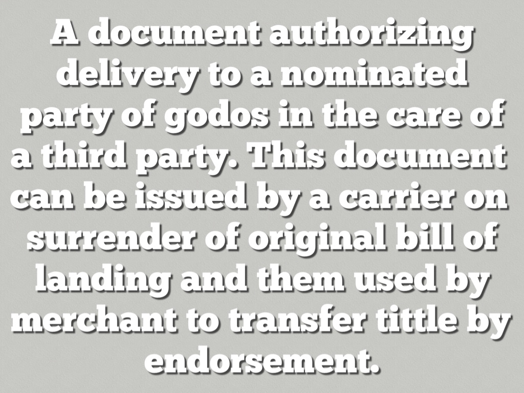 A document authorizing delivery to a nominated party of godos in the care of a third party. This document can be issued by a carrier on surrender of original bill of landing and them used by merchant to transfer tittle by endorsement.