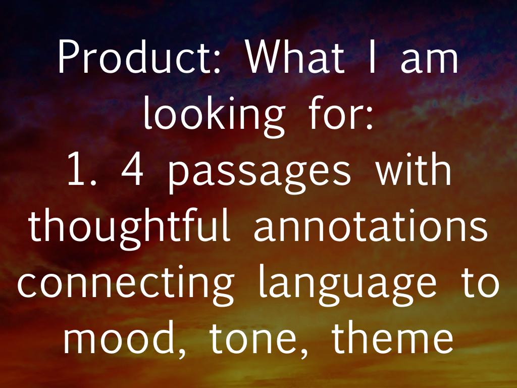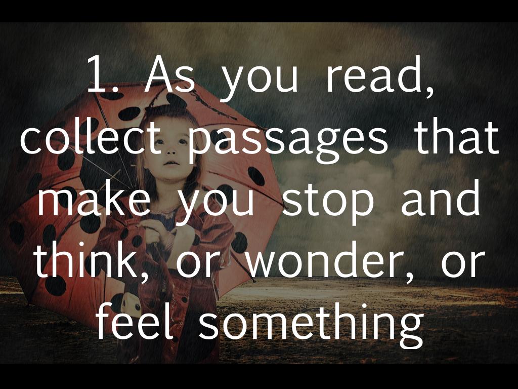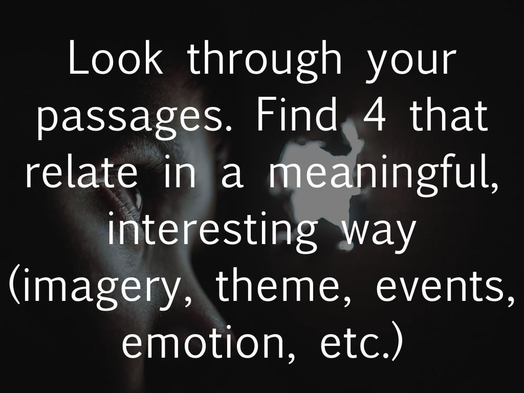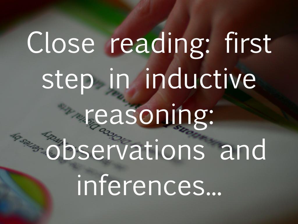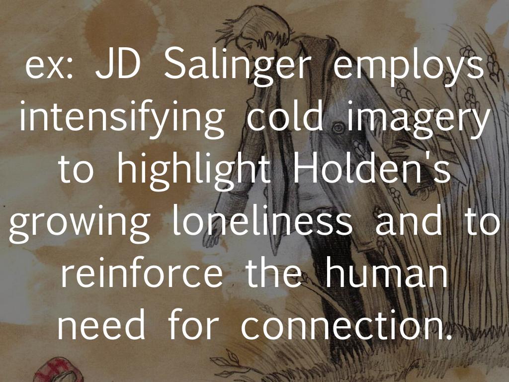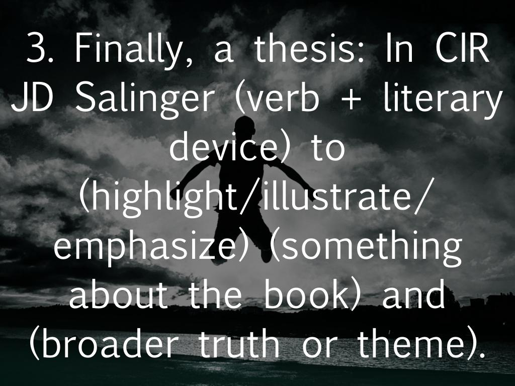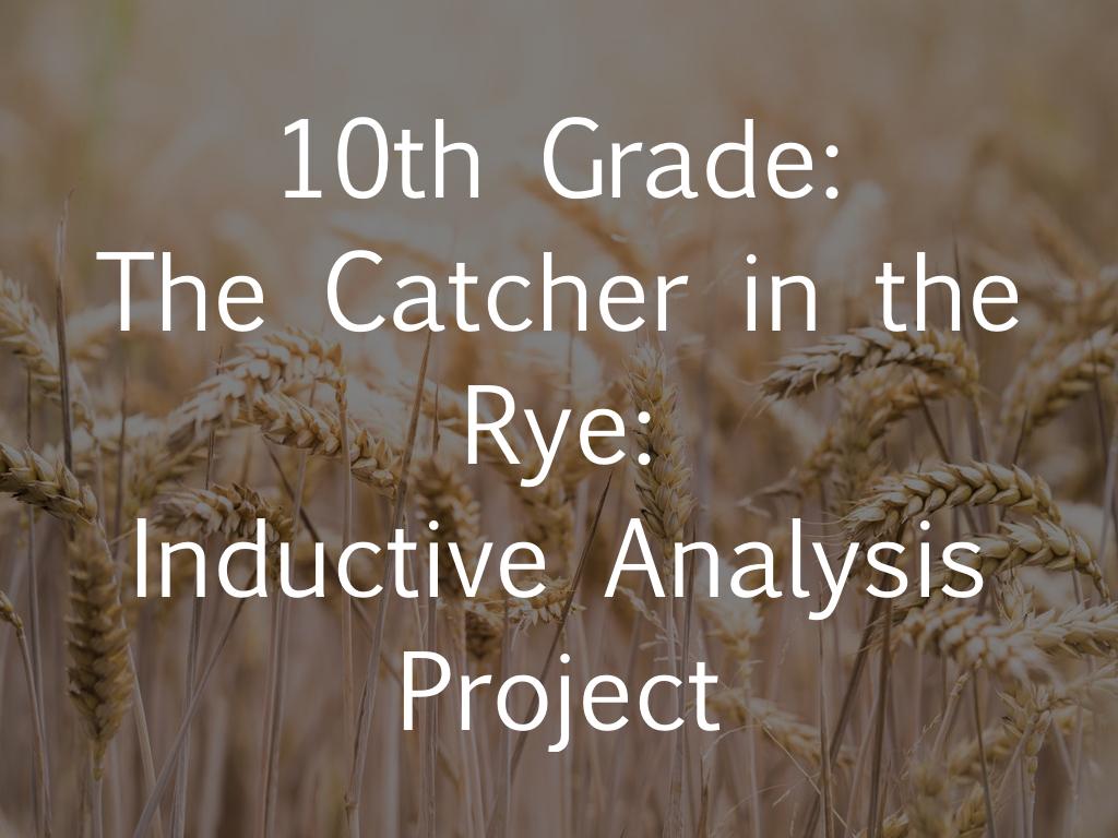 PRESENTATION OUTLINE10th Grade: The Catcher in the Rye: Inductive Analysis Project Write Away: What is hard about writing? What are the steps involved in writing a traditional essay about literature? 1. Thesis statement 2. Topic sentences (to support thesis) 3. Textual evidence (to support topic sentences) This is "Deductive Reasoning": Start with a premise or answer; find evidence to back it up. BUT, the real "magic" of inquiry and discovery happens by paying attention to details you observe, infer, notice patterns, draw connections, slowly building... Close reading: first step in inductive reasoning: observations and inferences... That pattern of observations and inferences builds toward your eventual interpretation Instead of "What is this novel's central message?" I could ask, "What do you notice as you read that seems meaningful?" This is an INDUCTIVE approach INductive Approach allows for more discovery unlocks more meaning allows for more variation and unique interpretation more playful, interesting, fun Important to move between the two: observing details, and making larger assertions 1. As you read, collect passages that make you stop and think, or wonder, or feel something Process: 2. From your "collection" of passages, choose 4 that are related in some way. They should each be a few sentences in length. Look through your passages. Find 4 that relate in a meaningful, interesting way (imagery, theme, events, emotion, etc.) 3. Pull your 4 related passages into a single document. Double (or even triple) space 4. Print. Then, annotate heavily (why? discovery): observations, inferences, questions, connections language devices, connotations, double meanings, images, symbols, patterns, What is the effect of language on the mood, tone, meaning? How does the passage connect to broader patterns and themes? How does it relate to the other passages? Example: repetition of the word "freezing": Effect on mood? Connection to themes? Look for connections among the passages and between the passages and the book as a whole Product: What I am looking for: 1. 4 passages with thoughtful annotations connecting language to mood, tone, theme See annotation resources: handouts and posted 2. Each passage has a topic sentence that asserts an analytical IDEA based on the close-reading of that passage. Topic sentences: Reasonable, yet arguable: can be supported with specific observations/examples from the passage. 3. Finally, a thesis: In CIR JD Salinger (verb + literary device) to (highlight/illustrate/ emphasize) (something about the book) and (broader truth or theme). ex: JD Salinger employs intensifying cold imagery to highlight Holden's growing loneliness and to reinforce the human need for connection. JD Salinger presents a recurring metaphor of Holden concealing an imaginary bullet wound to represent Holden’s repressed emotional pain, and to highlight the shame boys often feel to show emotional vulnerability. Format: Top Page: Heading Thesis Topic Sentences Behind that page: 4 related, annotated passages. (You only need topic sentences for 3.) After break: -Top-down Web -Draft One -Feedback and Revision -Final Draft Haiku Deck Pro User