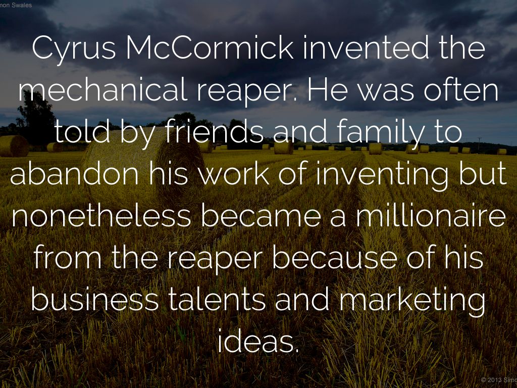Cyrus McCormick invented the mechanical reaper. He was often told by friends and family to abandon his work of inventing but nonetheless became a millionaire from the reaper because of his business talents and marketing ideas.