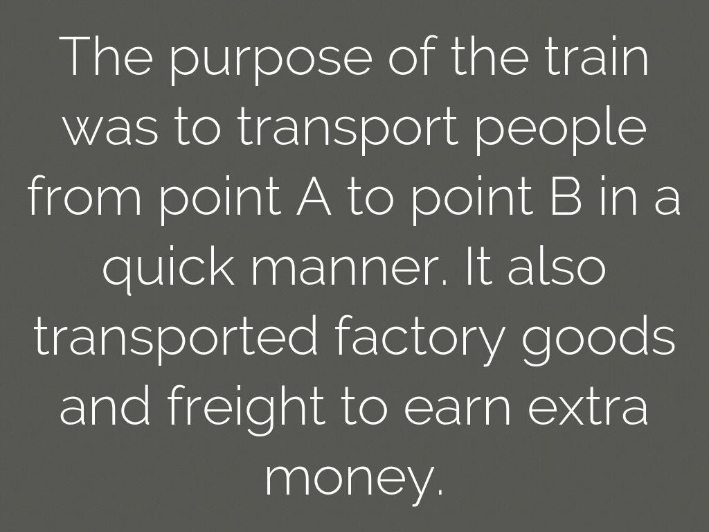 The purpose of the train was to transport people from point A to point B in a quick manner. It also transported factory goods and freight to earn extra money.