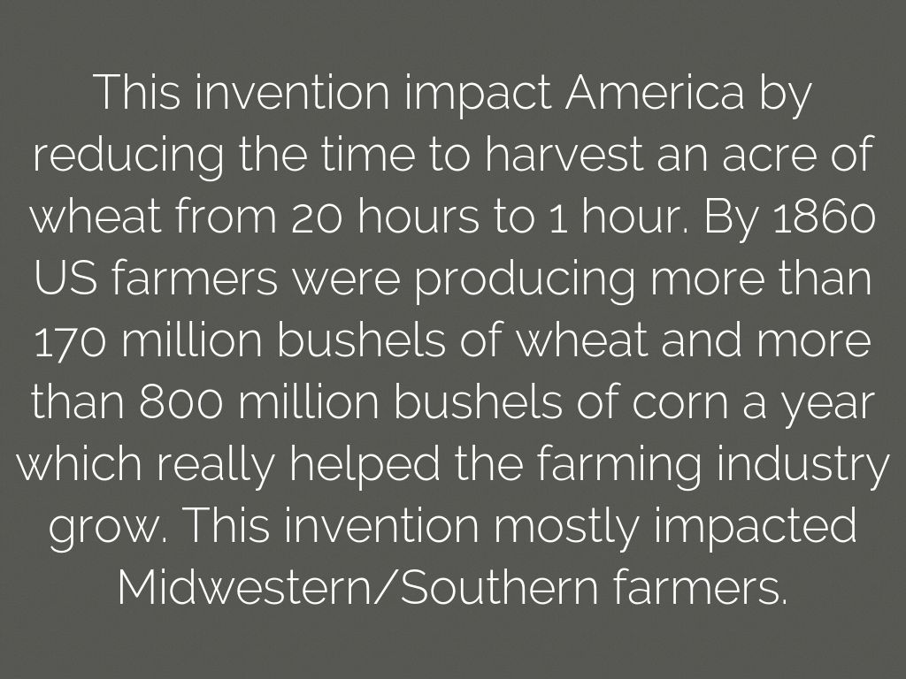 This invention impact America by reducing the time to harvest an acre of wheat from 20 hours to 1 hour. By 1860 US farmers were producing more than 170 million bushels of wheat and more than 800 million bushels of corn a year which really helped the farming industry grow. This invention mostly impacted Midwestern/Southern farmers.