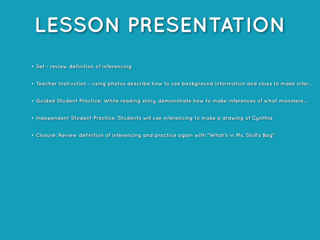Closure: Review definition of inferencing and practice again with "What's in Ms. Stull's Bag"