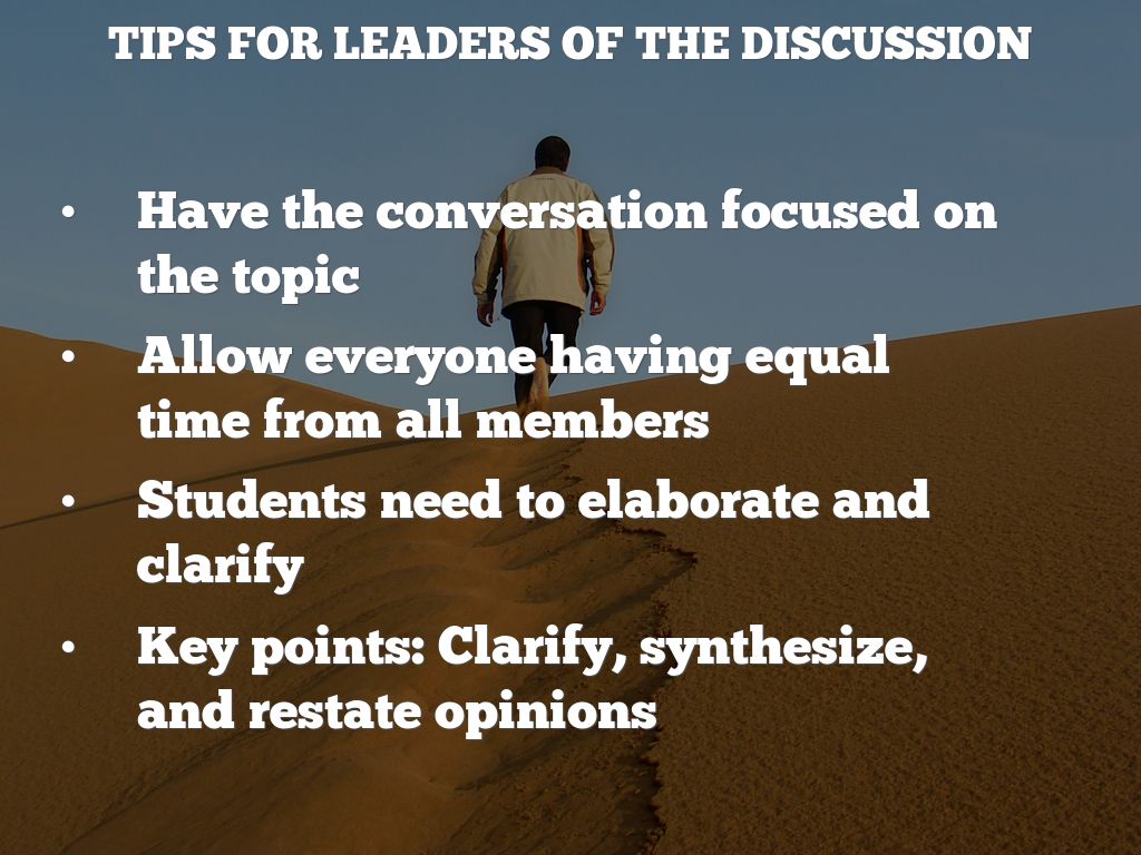 Begin the Discussion: Teacher can lead the coversation, but the goal is to have students take over through out the school year.