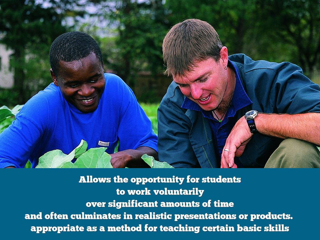 Allows the opportunity for students to work voluntarily over significant amounts of time and often culminates in realistic presentations or products. appropriate as a method for teaching certain basic skills