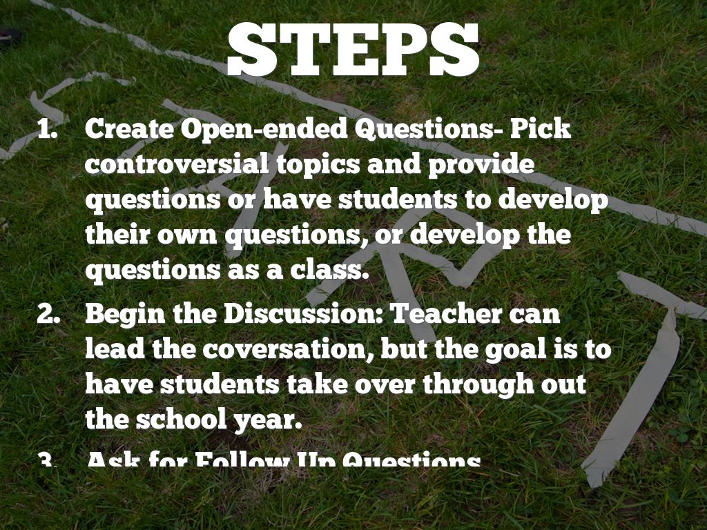 Create Open-ended Questions- Pick controversial topics and provide questions or have students to develop their own questions, or develop the questions as a class.