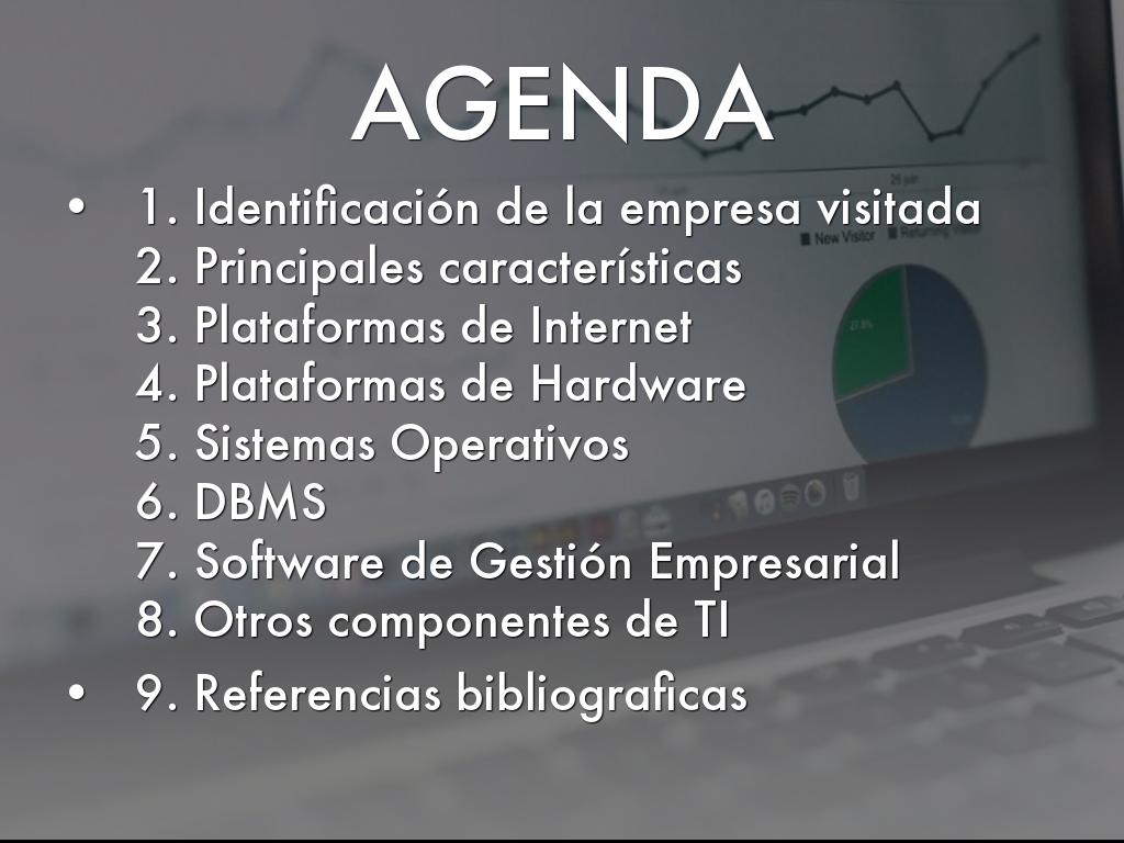 1. Identificación de la empresa visitada 2. Principales características 3. Plataformas de Internet 4. Plataformas de Hardware 5. Sistemas Operativos 6. DBMS 7. Software de Gestión Empresarial 8. Otros componentes de TI