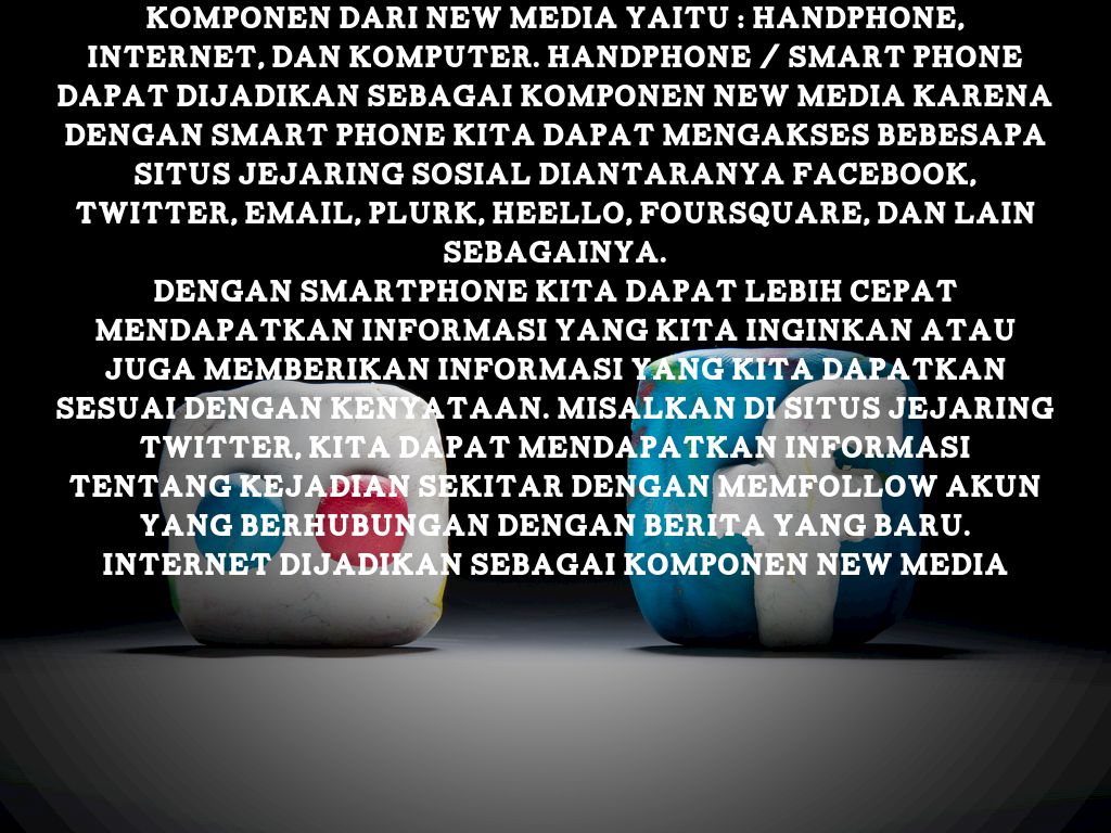 Komponen dari new media yaitu : Handphone, Internet, dan Komputer. Handphone / Smart Phone dapat dijadikan sebagai komponen New Media karena dengan Smart Phone kita dapat mengakses bebesapa situs jejaring sosial diantaranya Facebook, Twitter, Email, Plurk, Heello, FourSquare, dan lain sebagainya.