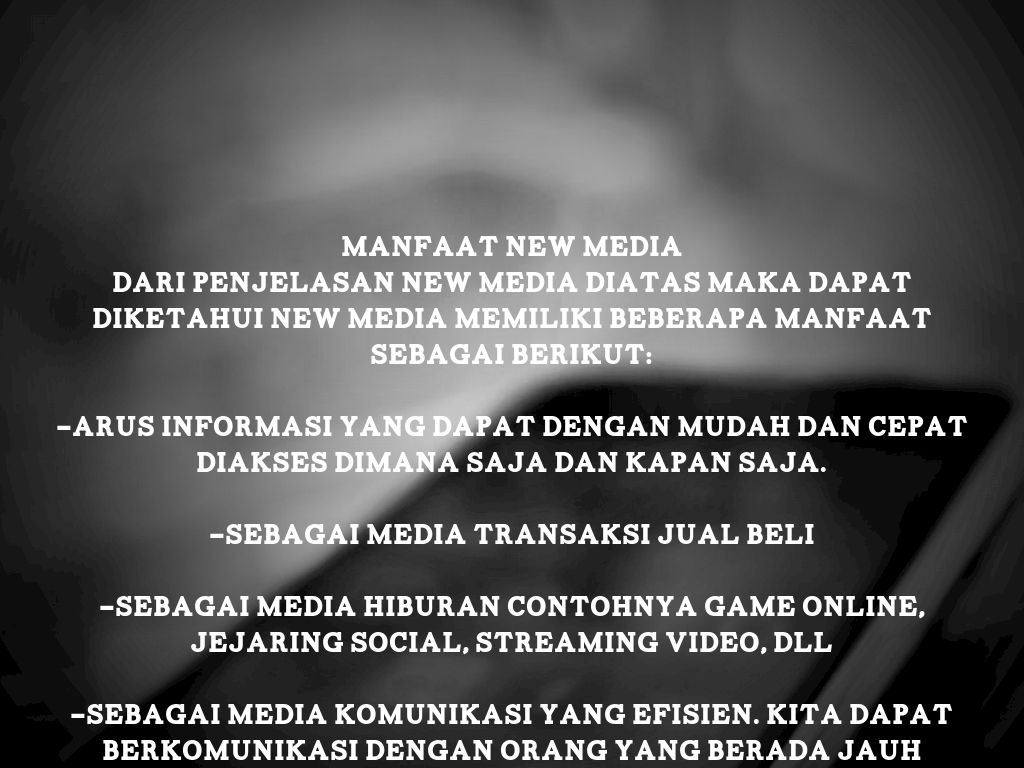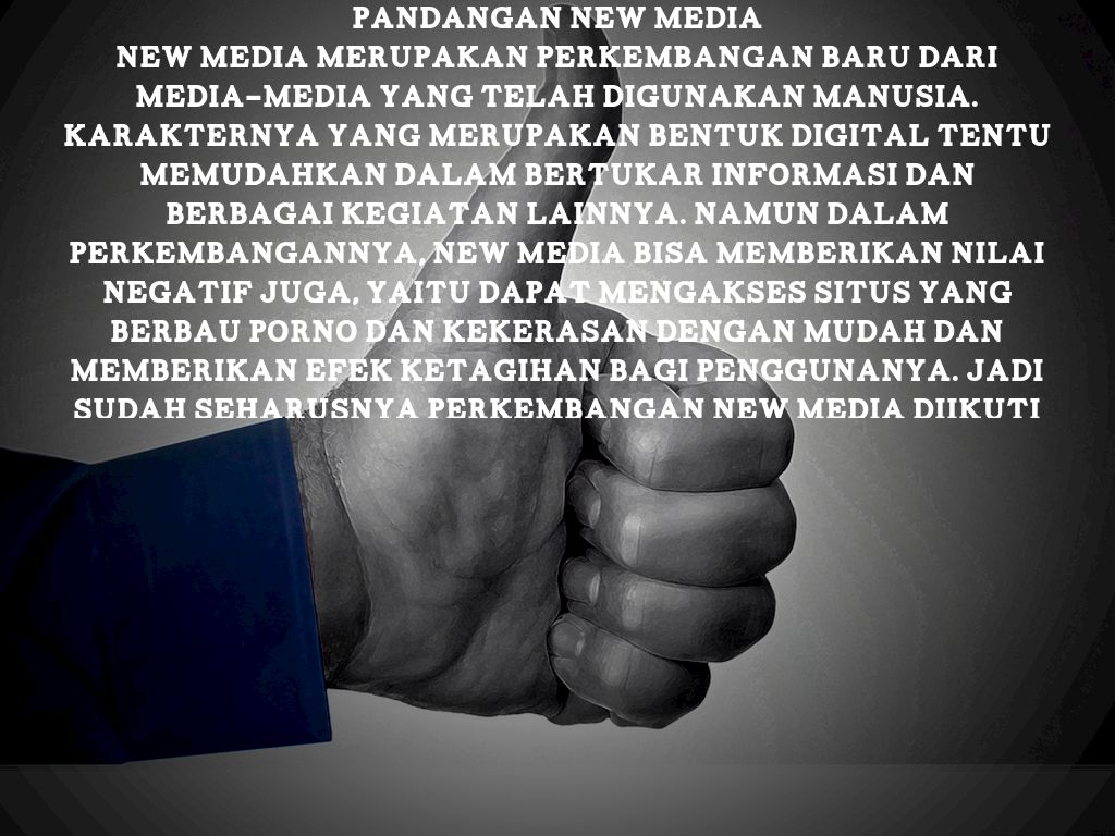 New Media terdiri dari 2 kata yaitu New dan Media. New yang berarti Baru dan Media yang berarti Perantara. Jadi New Media merupakan Sarana perantara yang baru. Baru dalam arti disini dilihat dari segi waktu, manfaat, produksi, dan distribusinya. New Media juga dapat disebut sebuah istilah yang dimaksudkan untuk mencakup kemunculan digital, komputer, atau jaringan teknologi informasi dan komunikasi di akhir abad ke-20. Beberapa contoh New Media adalah Internet, website, komputer multimedia, permainan komputer, CD-ROMS, dan DVD.