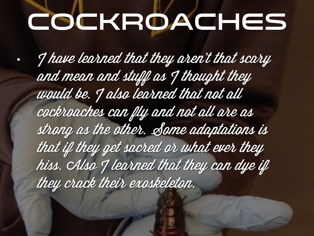I have learned that they aren't that scary and mean and stuff as I thought they would be. I also learned that not all cockroaches can fly and not all are as strong as the other. Some adaptations is that if they get sacred or what ever they hiss. Also I learned that they can dye if they crack their exoskeleton.