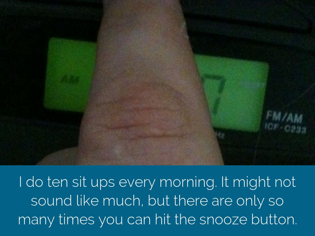 I do ten sit ups every morning. It might not sound like much, but there are only so many times you can hit the snooze button.