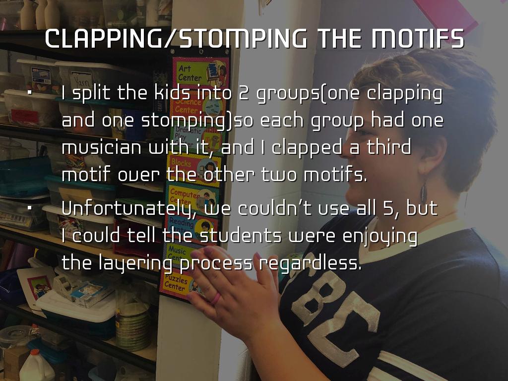 I split the kids into 2 groups(one clapping and one stomping)so each group had one musician with it, and I clapped a third motif over the other two motifs.