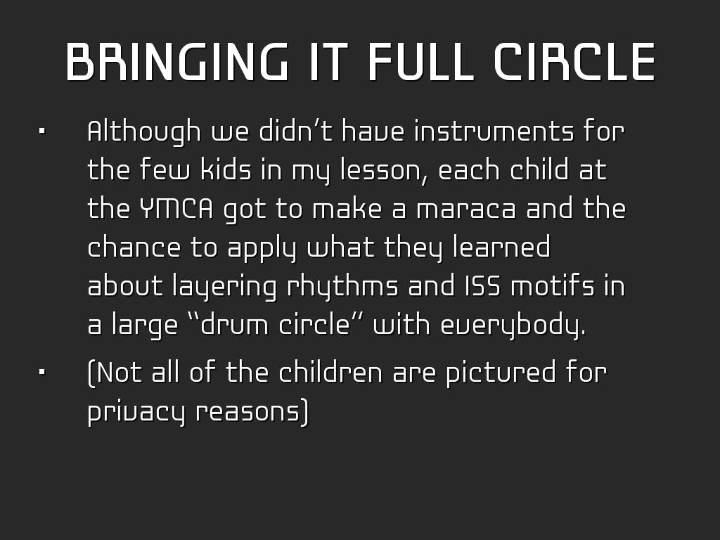 Although we didn’t have instruments for the few kids in my lesson, each child at the YMCA got to make a maraca and the chance to apply what they learned about layering rhythms and ISS motifs in a large “drum circle” with everybody.
