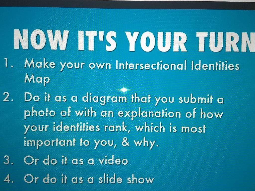 No matter what format you choose, please explain how your identities are ranked, which is most important to you and why. 1) submit a photo of a diagram you create. 2) make a video using flipgrid. 3) make a slide show. This one was made using Haiku