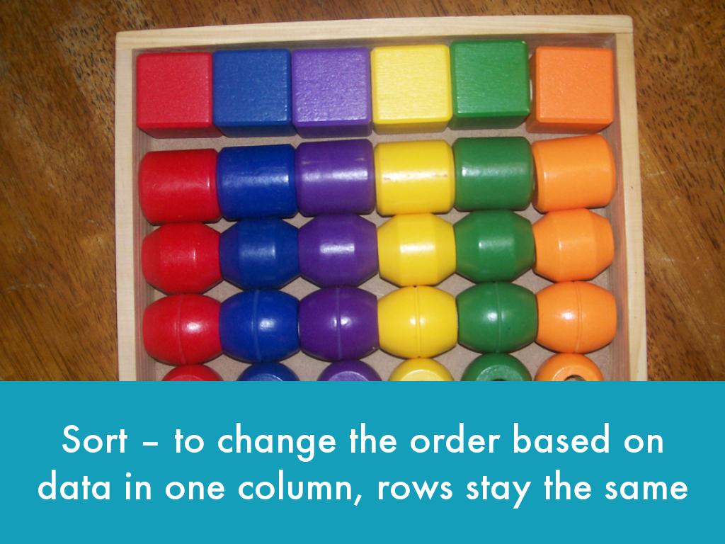 Sort – to change the order based on data in one column, rows stay the same