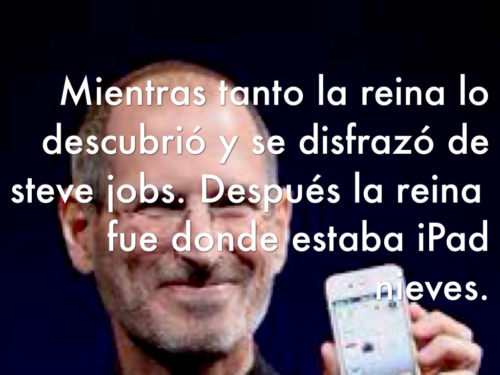 Mientras tanto la reina lo descubrió y se disfrazó de steve jobs. Después la reina fue donde estaba iPad nieves.
