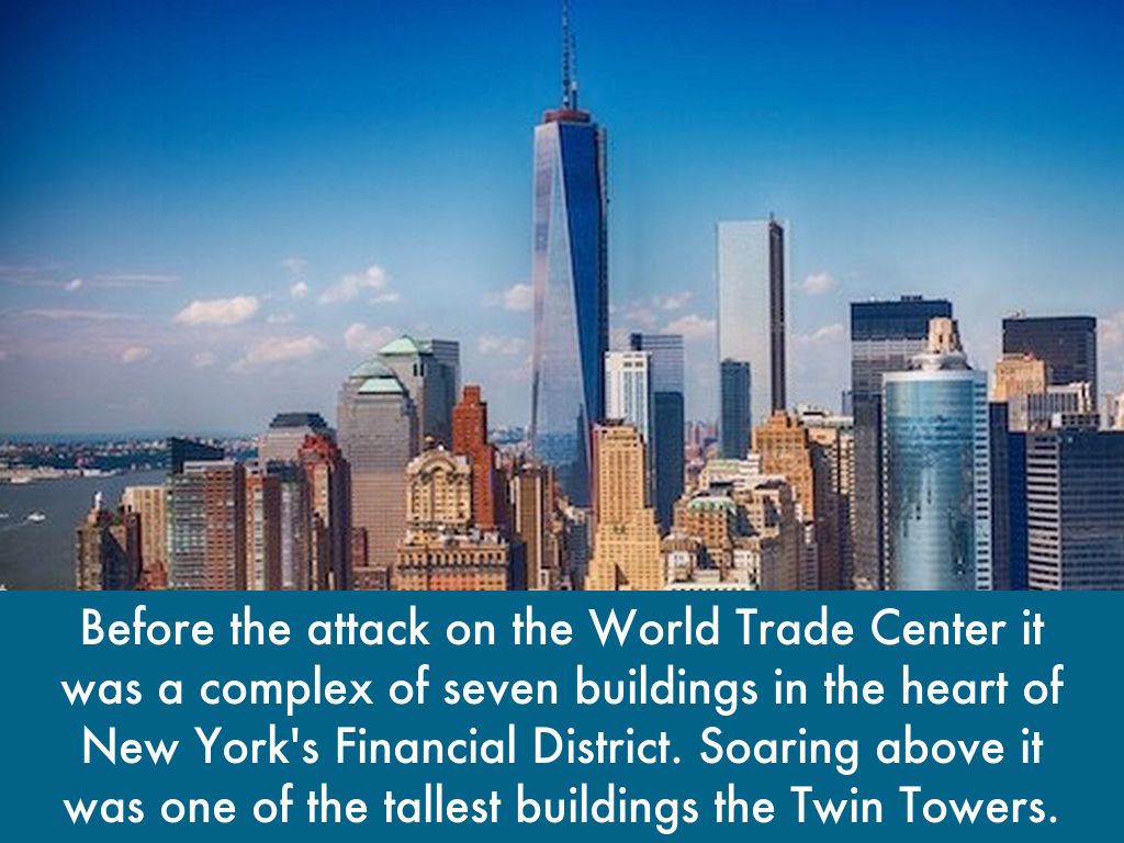 Before the attack on the World Trade Center it was a complex of seven buildings in the heart of New York's Financial District. Soaring above it was one of the tallest buildings the Twin Towers.