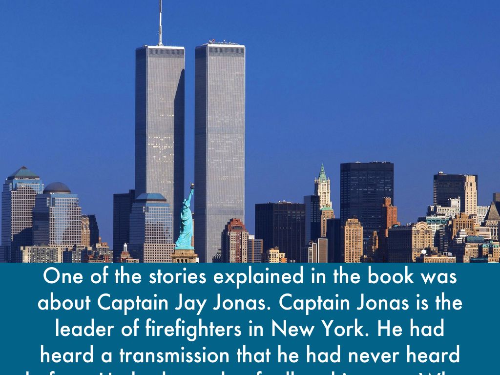 One of the stories explained in the book was about Captain Jay Jonas. Captain Jonas is the leader of firefighters in New York. He had heard a transmission that he had never heard before. He had a code of talk to his crew. When he said Ten- Sixty it meant a catastrophic event. He went to the World Trade Center and it was on fire burning. When he went in he was not sure if he got out alive.