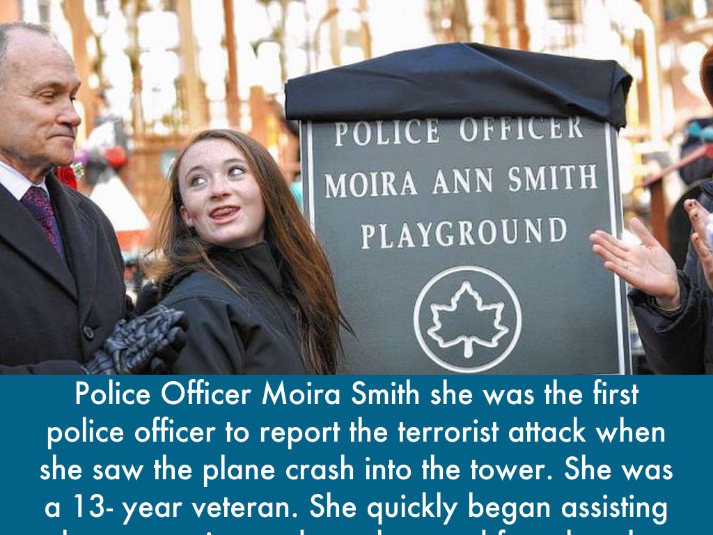 Police Officer Moira Smith she was the first police officer to report the terrorist attack when she saw the plane crash into the tower. She was a 13- year veteran. She quickly began assisting the evacuation and was honored for what she did.