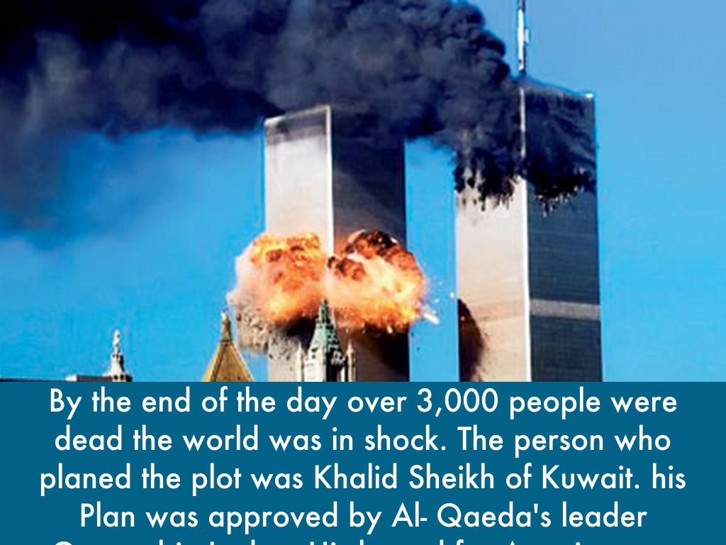 By the end of the day over 3,000 people were dead the world was in shock. The person who planed the plot was Khalid Sheikh of Kuwait. his Plan was approved by Al- Qaeda's leader Osama bin Laden. His hatred for America was terrifying. 19 young terorist fundamentalist spent two years training for the 9/11 attack.