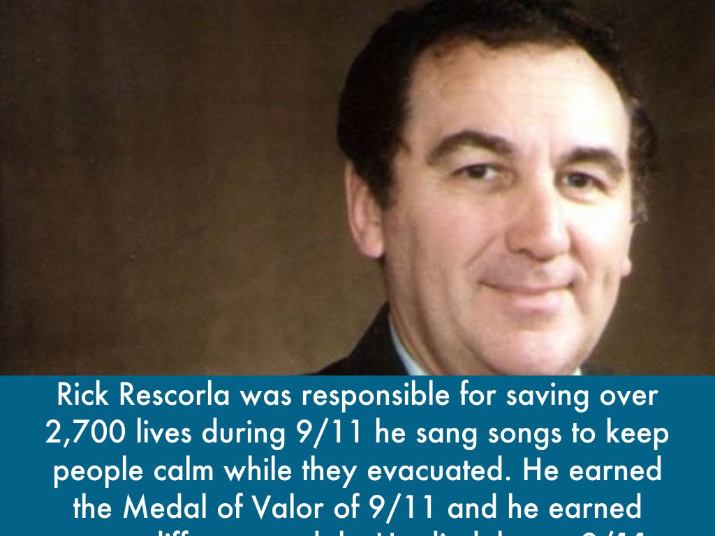 Rick Rescorla was responsible for saving over 2,700 lives during 9/11 he sang songs to keep people calm while they evacuated. He earned the Medal of Valor of 9/11 and he earned many different medals. He died the on 9/11 while tryng to rescue people.