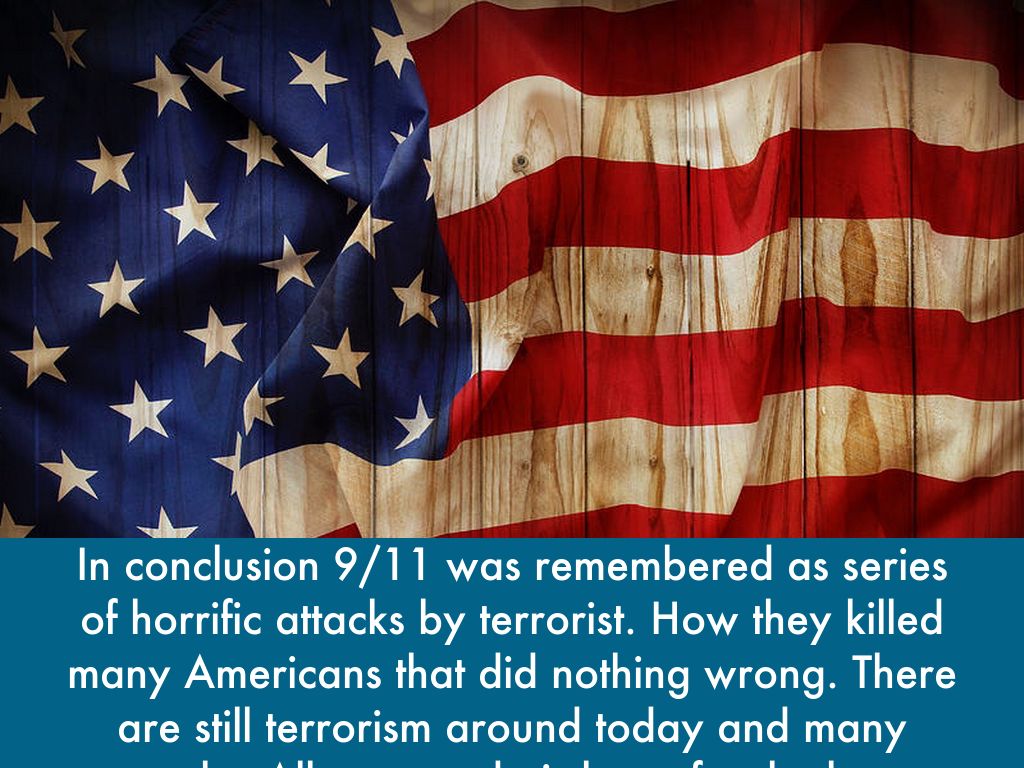 In conclusion 9/11 was remembered as series of horrific attacks by terrorist. How they killed many Americans that did nothing wrong. There are still terrorism around today and many attacks. All we can do is hope for the best.