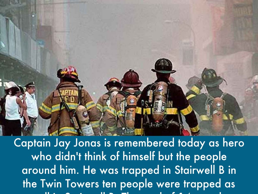 Captain Jay Jonas is remembered today as hero who didn't think of himself but the people around him. He was trapped in Stairwell B in the Twin Towers ten people were trapped as well in Stairwell B. The total of 14 people survived the collapse wile 2,753 people died.