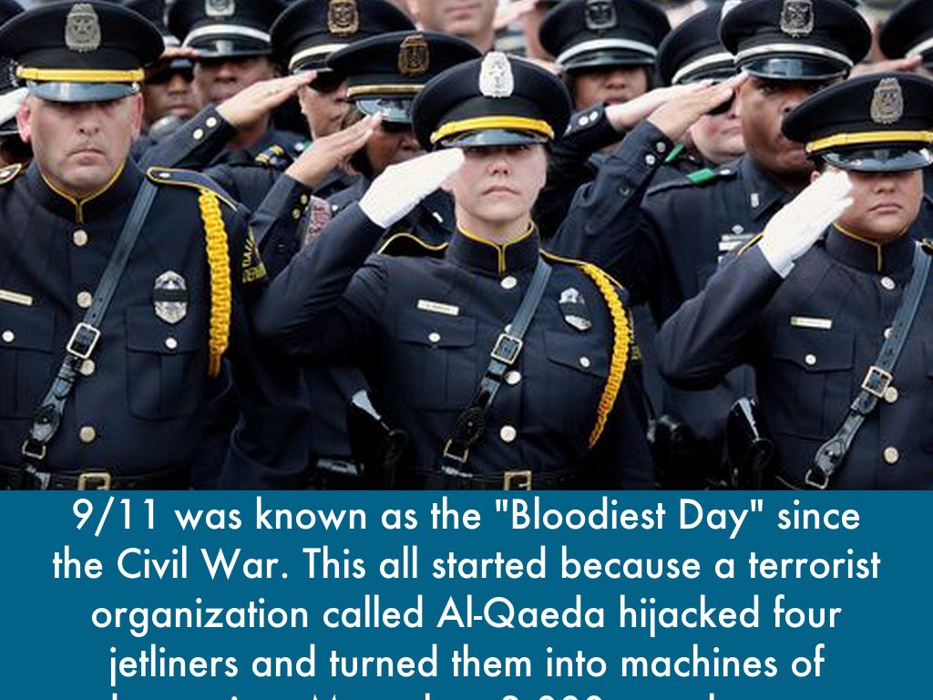 9/11 was known as the "Bloodiest Day" since the Civil War. This all started because a terrorist organization called Al-Qaeda hijacked four jetliners and turned them into machines of destruction. More than 3,000 people were killed in a instant because of the attack