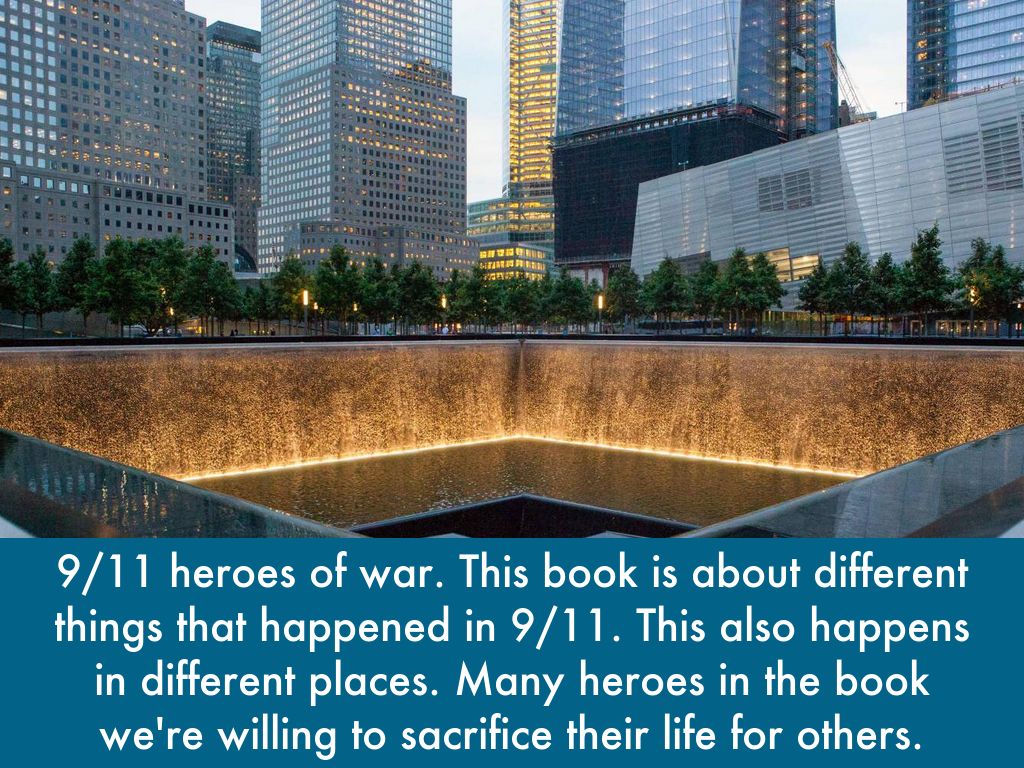 9/11 heroes of war. This book is about different things that happened in 9/11. This also happens in different places. Many heroes in the book we're willing to sacrifice their life for others.