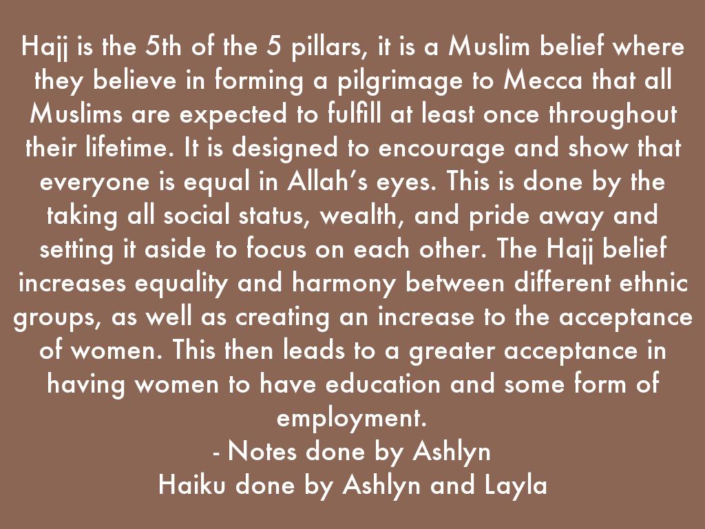 Hajj is the 5th of the 5 pillars, it is a Muslim belief where they believe in forming a pilgrimage to Mecca that all Muslims are expected to fulfill at least once throughout their lifetime. It is designed to encourage and show that everyone is equal in Allah’s eyes. This is done by the taking all social status, wealth, and pride away and setting it aside to focus on each other. The Hajj belief increases equality and harmony between different ethnic groups, as well as creating an increase to the acceptance of women. This then leads to a greater acceptance in having women to have education and some form of employment.