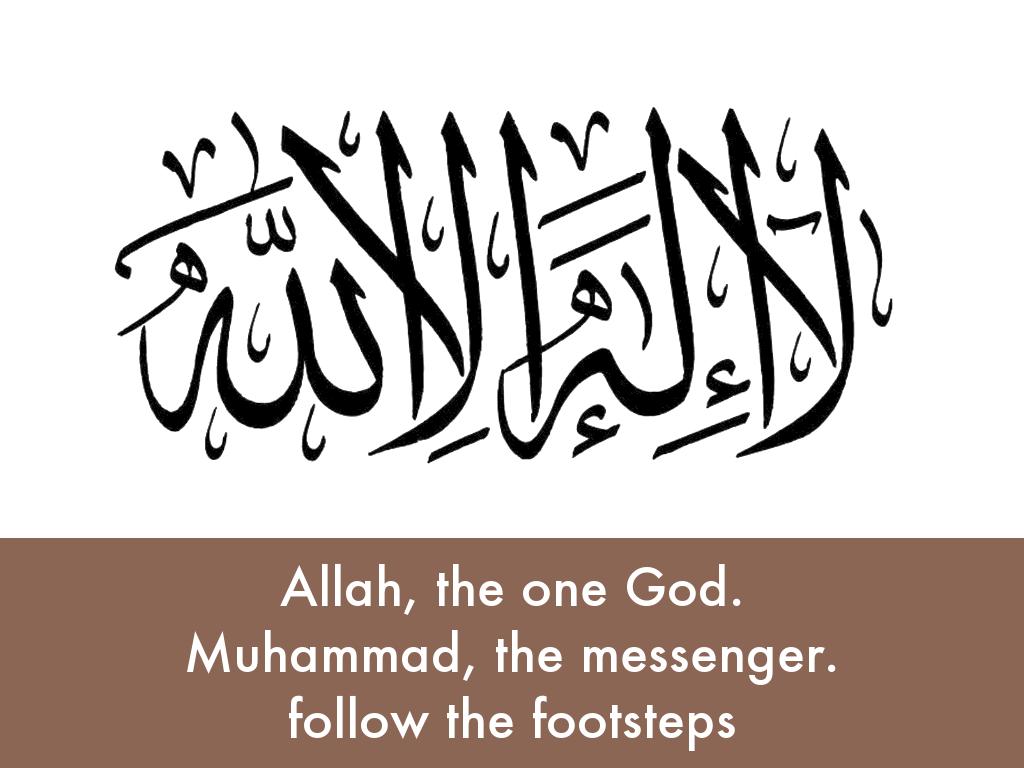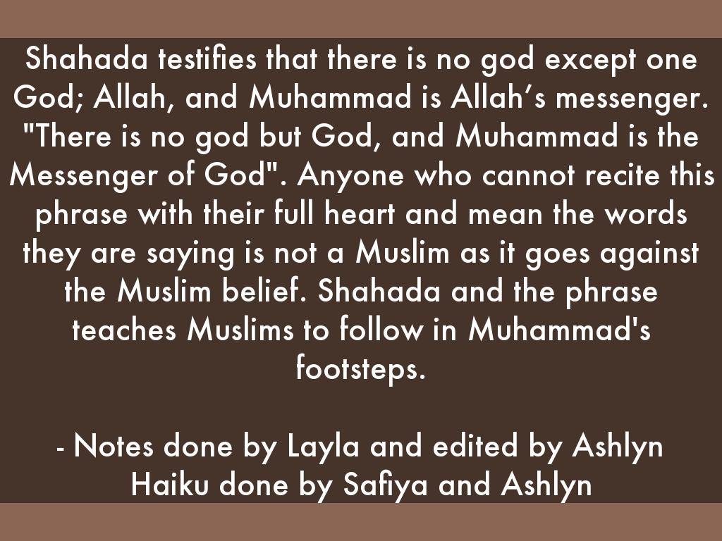 Shahada testifies that there is no god except one God; Allah, and Muhammad is Allah’s messenger. "There is no god but God, and Muhammad is the Messenger of God". Anyone who cannot recite this phrase with their full heart and mean the words they are saying is not a Muslim as it goes against the Muslim belief. Shahada and the phrase teaches Muslims to follow in Muhammad's footsteps.