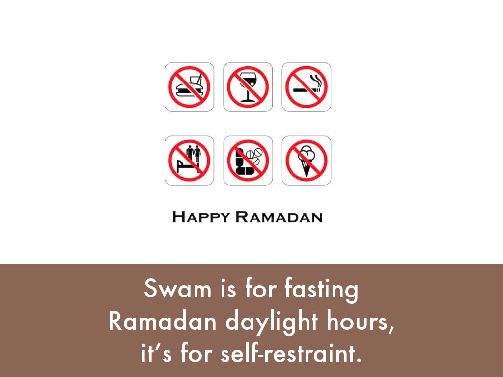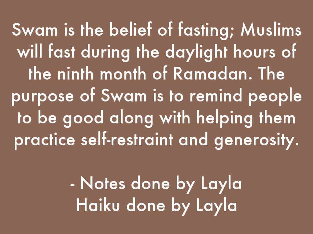 Swam is the belief of fasting; Muslims will fast during the daylight hours of the ninth month of Ramadan. The purpose of Swam is to remind people to be good along with helping them practice self-restraint and generosity.