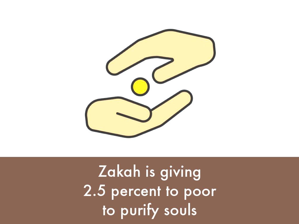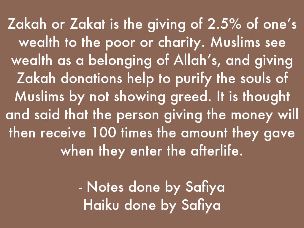 Zakah or Zakat is the giving of 2.5% of one’s wealth to the poor or charity. Muslims see wealth as a belonging of Allah’s, and giving Zakah donations help to purify the souls of Muslims by not showing greed. It is thought and said that the person giving the money will then receive 100 times the amount they gave when they enter the afterlife.