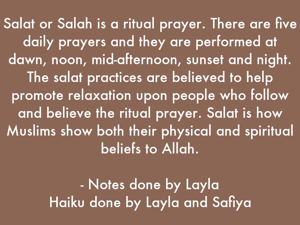 Salat or Salah is a ritual prayer. There are five daily prayers and they are performed at dawn, noon, mid-afternoon, sunset and night. The salat practices are believed to help promote relaxation upon people who follow and believe the ritual prayer. Salat is how Muslims show both their physical and spiritual beliefs to Allah.