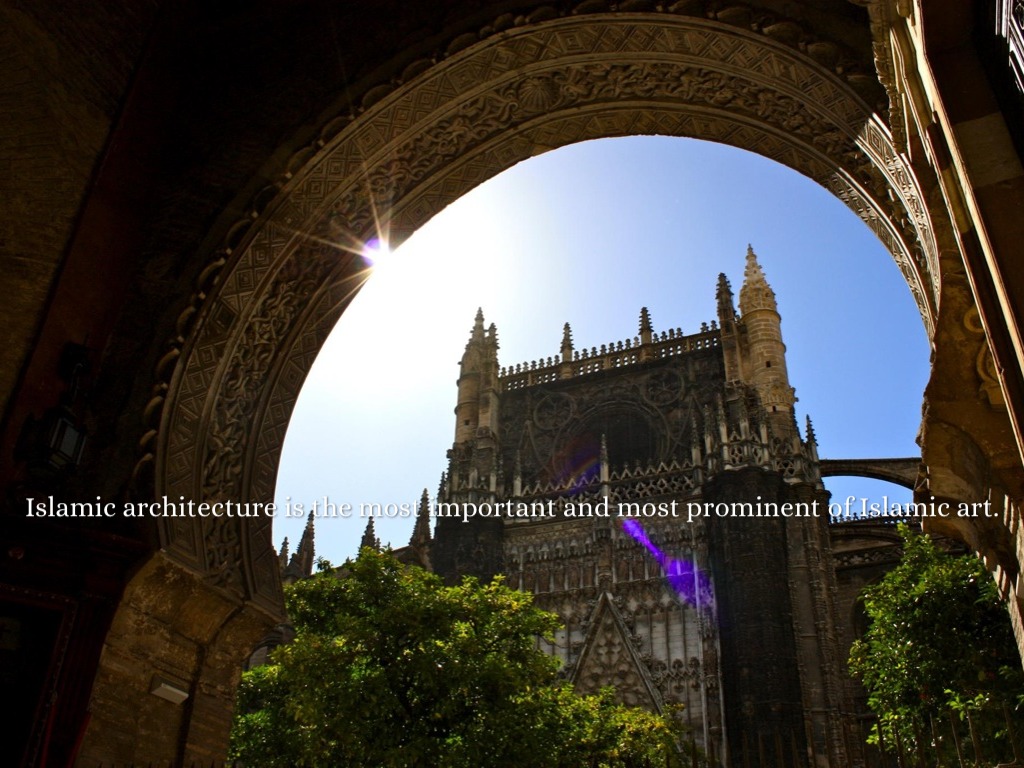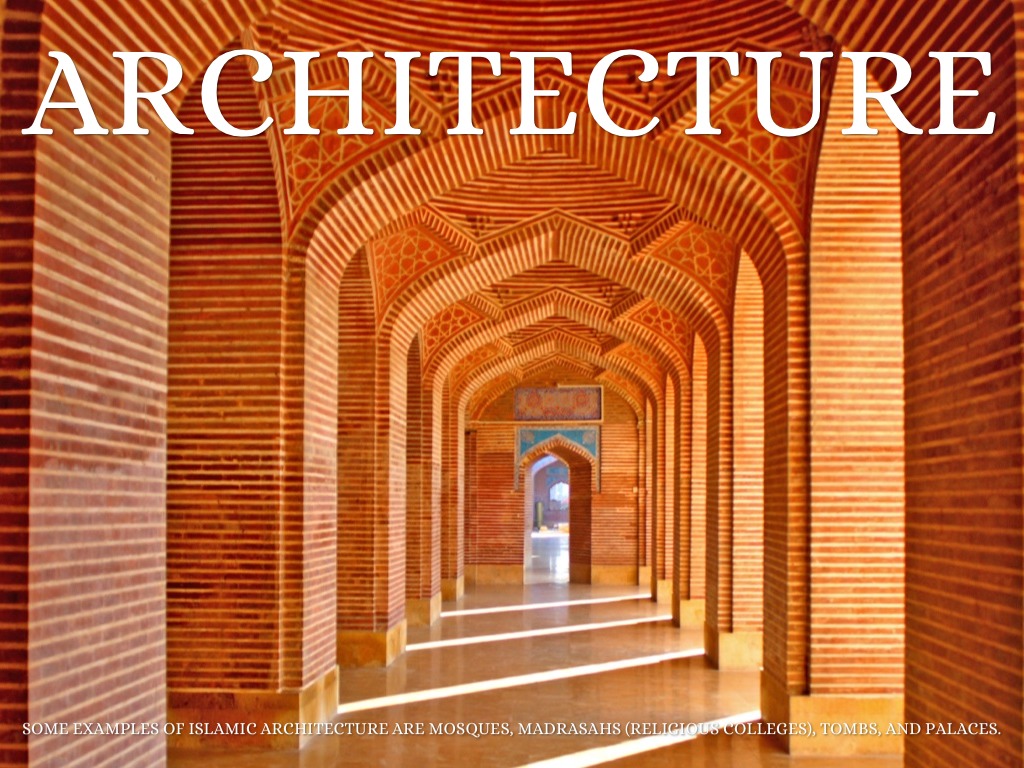 SOME EXAMPLES OF ISLAMIC ARCHITECTURE ARE MOSQUES, MADRASAHS (RELIGIOUS COLLEGES), TOMBS, AND PALACES.