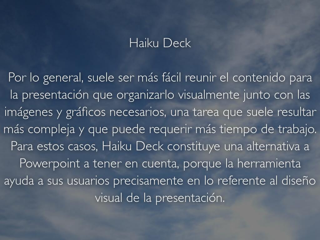 Por lo general, suele ser más fácil reunir el contenido para la presentación que organizarlo visualmente junto con las imágenes y gráficos necesarios, una tarea que suele resultar más compleja y que puede requerir más tiempo de trabajo. Para estos casos, Haiku Deck constituye una alternativa a Powerpoint a tener en cuenta, porque la herramienta ayuda a sus usuarios precisamente en lo referente al diseño visual de la presentación.