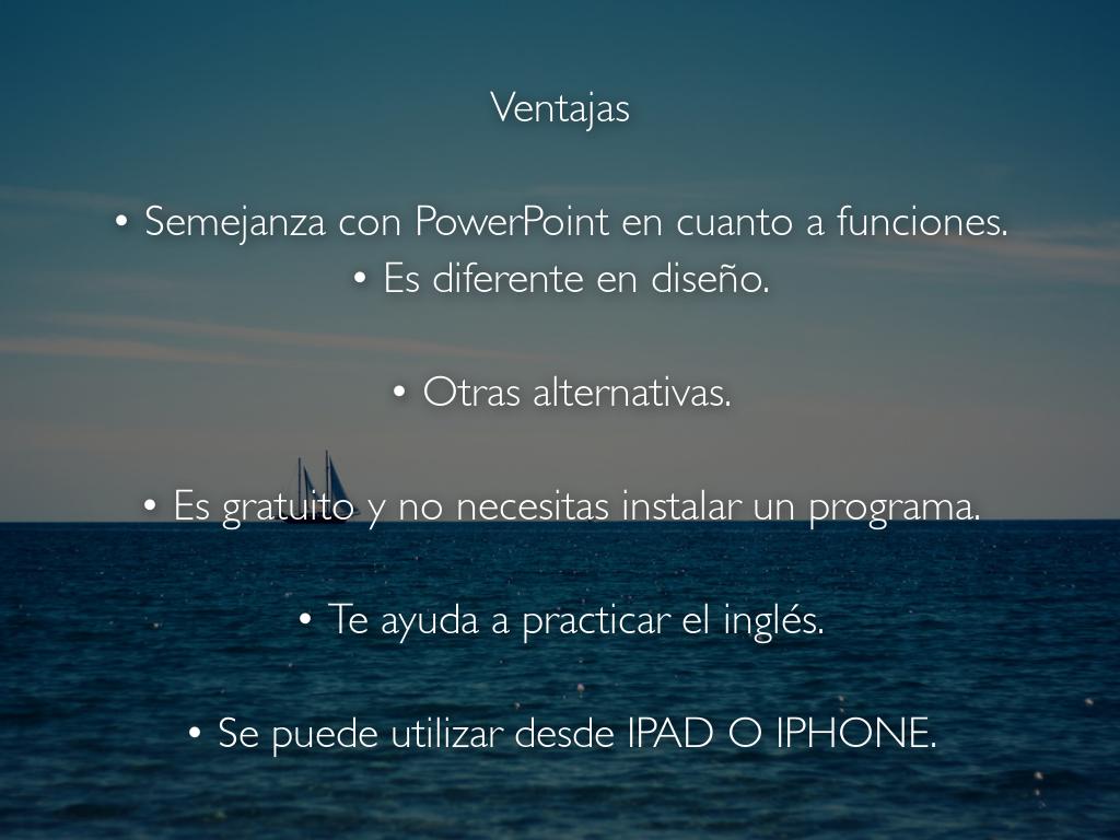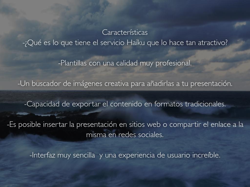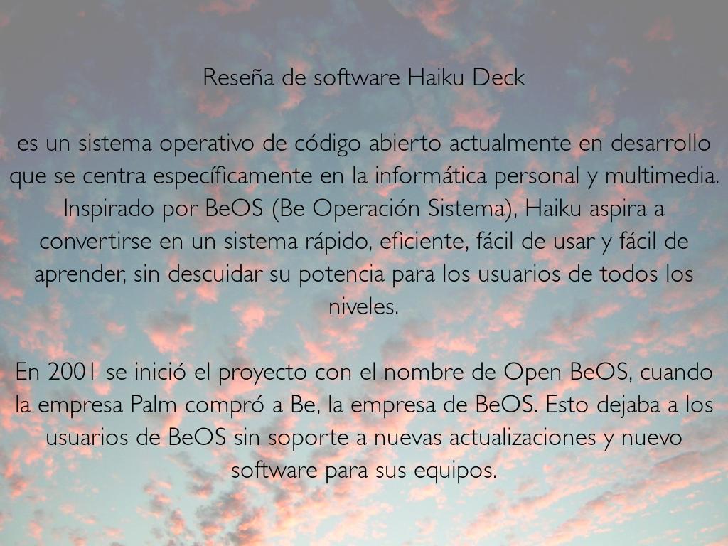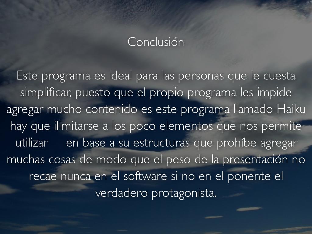 Este programa es ideal para las personas que le cuesta simplificar, puesto que el propio programa les impide agregar mucho contenido es este programa llamado Haiku hay que ilimitarse a los poco elementos que nos permite utilizar en base a su estructuras que prohíbe agregar muchas cosas de modo que el peso de la presentación no recae nunca en el software si no en el ponente el verdadero protagonista.