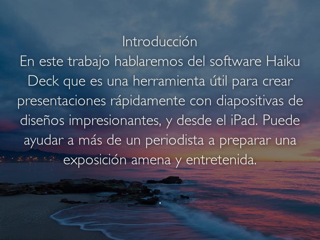 Introducción En este trabajo hablaremos del software Haiku Deck que es una herramienta útil para crear presentaciones rápidamente con diapositivas de diseños impresionantes, y desde el iPad. Puede ayudar a más de un periodista a preparar una exposición amena y entretenida.