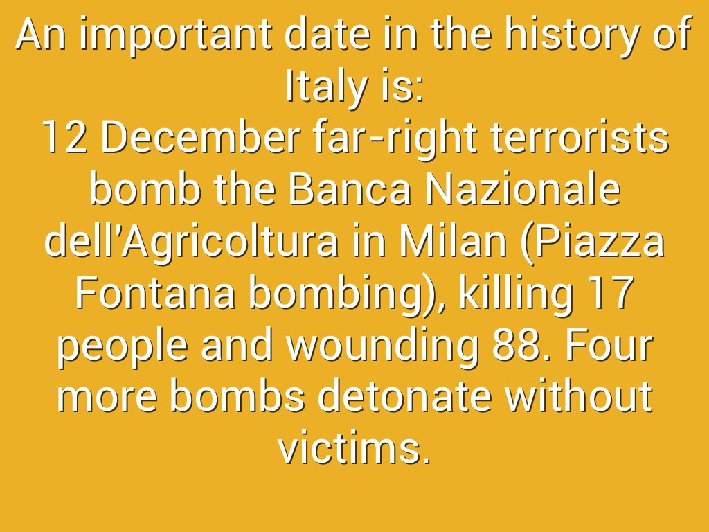 12 December far-right terrorists bomb the Banca Nazionale dell'Agricoltura in Milan (Piazza Fontana bombing), killing 17 people and wounding 88. Four more bombs detonate without victims.