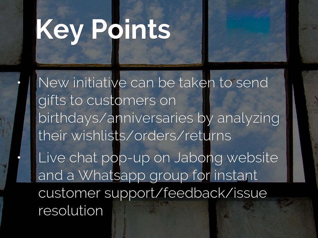 Jabong has to move beyond the traditional buyer-seller relationship instead establish a strategic relationship or a personal bond with customer which will help in gaining competitive advantage over its competitors.