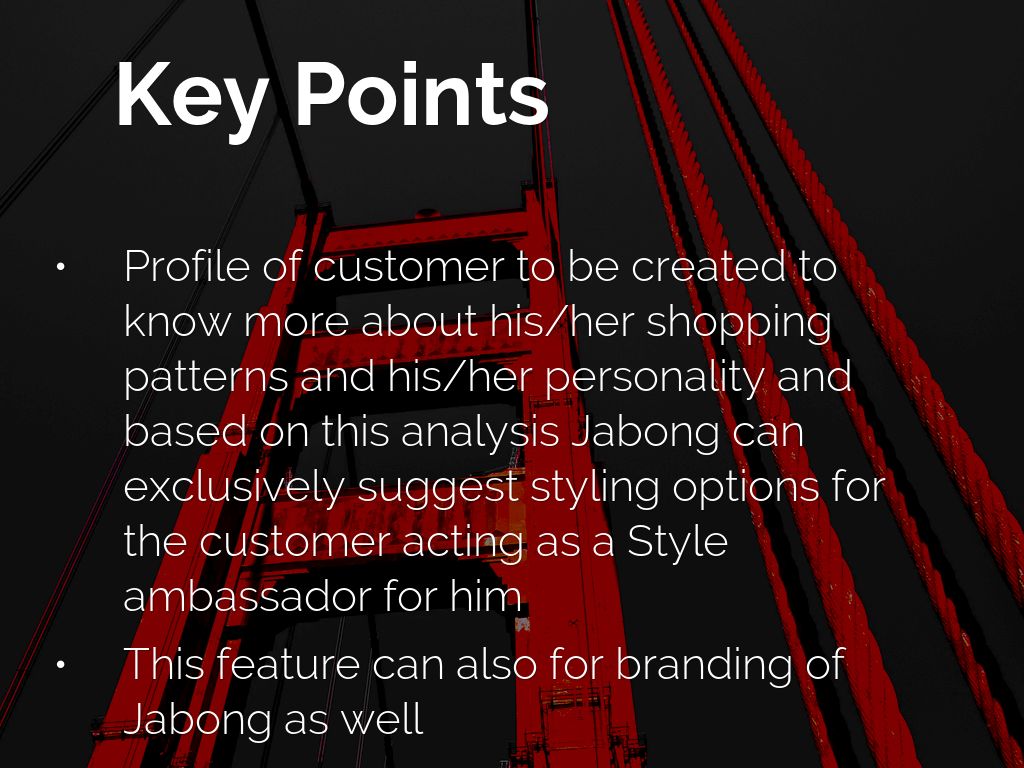 Profile of customer to be created to know more about his/her shopping patterns and his/her personality and based on this analysis Jabong can exclusively suggest styling options for the customer acting as a Style ambassador for him