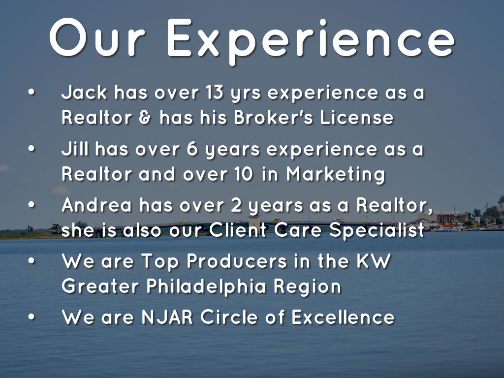 Jack and Jill at the Shore should be your FIRST and ONLY choice when buying or selling real estate in South Jersey at the Jersey Shore. We cover all your real estate needs for ALL of Atlantic and Cape May Counties, both on and off the islands. Check out the Deck and see who we are and WHY we are Top Producers! Contact us at 609-602-7140 JackandJill@kw.com Our websites http://www.jackandjillattheshore.com http://www.southjerseyhomelistings.com