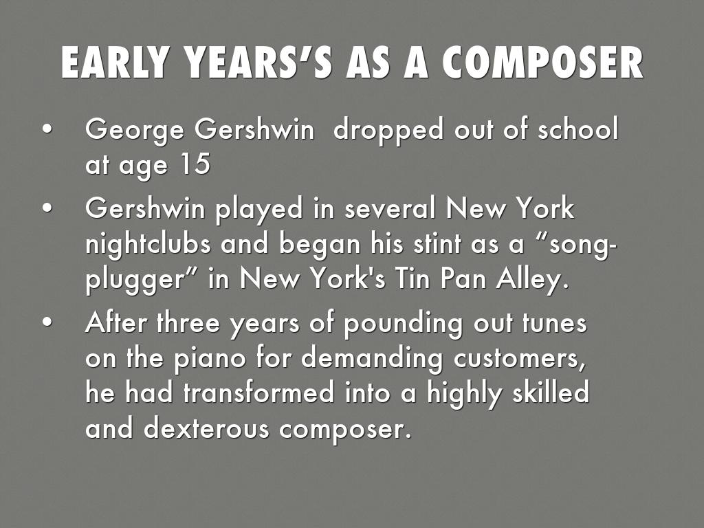 Gershwin played in several New York nightclubs and began his stint as a “song-plugger” in New York's Tin Pan Alley.