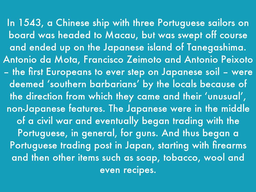 In 1543, a Chinese ship with three Portuguese sailors on board was headed to Macau, but was swept off course and ended up on the Japanese island of Tanegashima. Antonio da Mota, Francisco Zeimoto and Antonio Peixoto – the first Europeans to ever step on Japanese soil – were deemed ‘southern barbarians’ by the locals because of the direction from which they came and their ‘unusual’, non-Japanese features. The Japanese were in the middle of a civil war and eventually began trading with the Portuguese, in general, for guns. And thus began a Portuguese trading post in Japan, starting with firearms and then other items such as soap, tobacco, wool and even recipes.