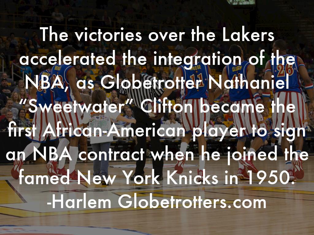 The victories over the Lakers accelerated the integration of the NBA, as Globetrotter Nathaniel “Sweetwater” Clifton became the first African-American player to sign an NBA contract when he joined the famed New York Knicks in 1950. -Harlem Globetrotters.com