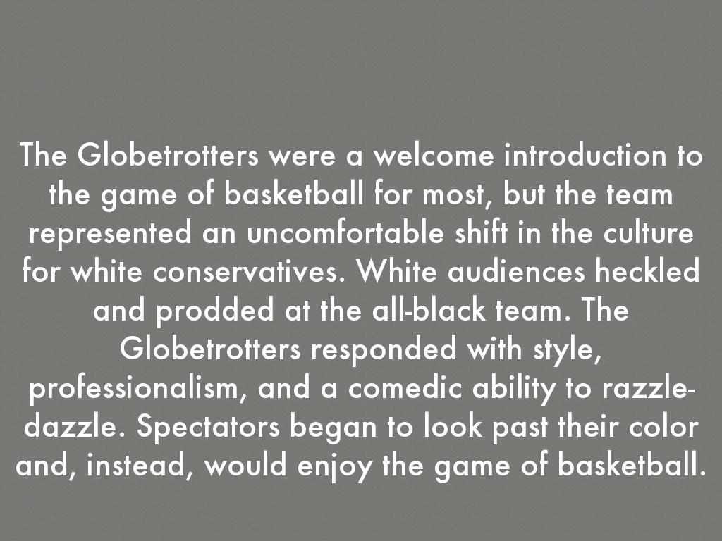 The Globetrotters were a welcome introduction to the game of basketball for most, but the team represented an uncomfortable shift in the culture for white conservatives. White audiences heckled and prodded at the all-black team. The Globetrotters responded with style, professionalism, and a comedic ability to razzle-dazzle. Spectators began to look past their color and, instead, would enjoy the game of basketball.
