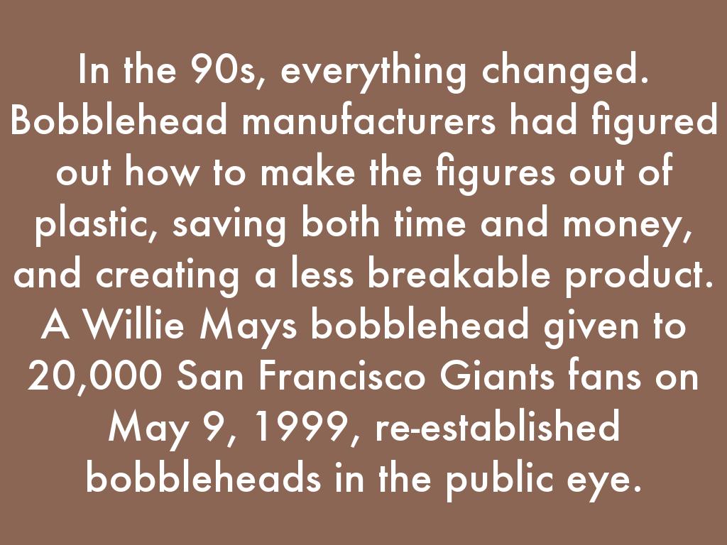 In the 90s, everything changed. Bobblehead manufacturers had figured out how to make the figures out of plastic, saving both time and money, and creating a less breakable product. A Willie Mays bobblehead given to 20,000 San Francisco Giants fans on May 9, 1999, re-established bobbleheads in the public eye.