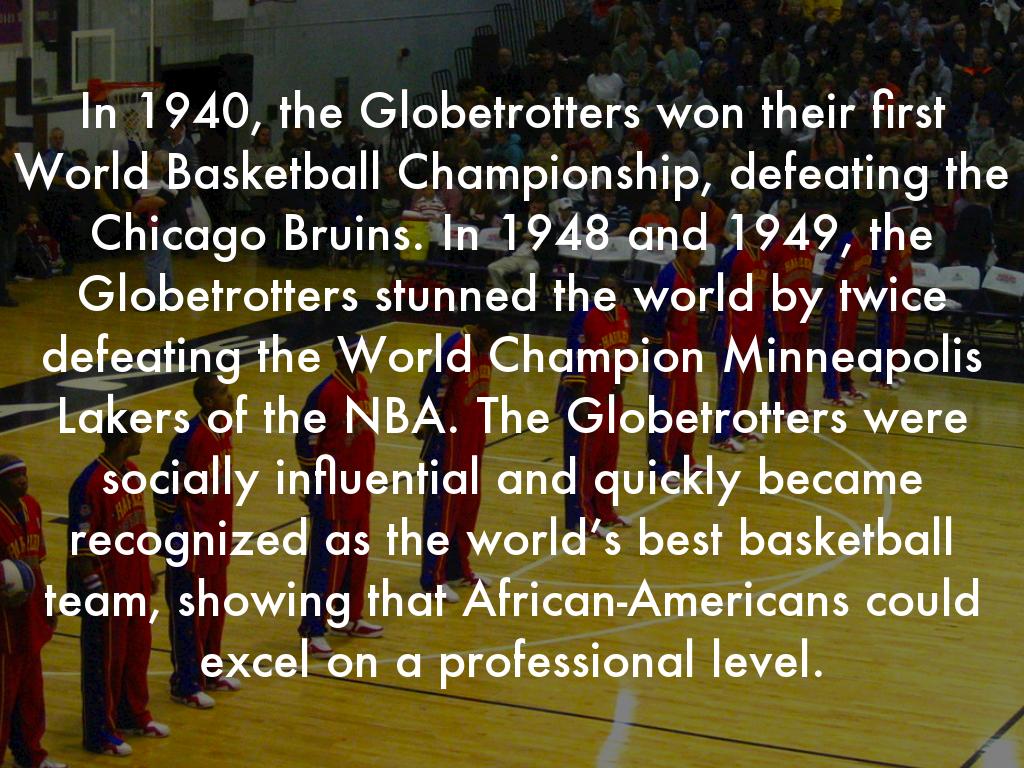 In 1940, the Globetrotters won their first World Basketball Championship, defeating the Chicago Bruins. In 1948 and 1949, the Globetrotters stunned the world by twice defeating the World Champion Minneapolis Lakers of the NBA. The Globetrotters were socially influential and quickly became recognized as the world’s best basketball team, showing that African-Americans could excel on a professional level.