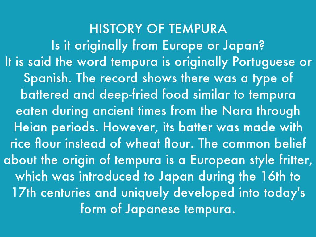 It is said the word tempura is originally Portuguese or Spanish. The record shows there was a type of battered and deep-fried food similar to tempura eaten during ancient times from the Nara through Heian periods. However, its batter was made with rice flour instead of wheat flour. The common belief about the origin of tempura is a European style fritter, which was introduced to Japan during the 16th to 17th centuries and uniquely developed into today's form of Japanese tempura.