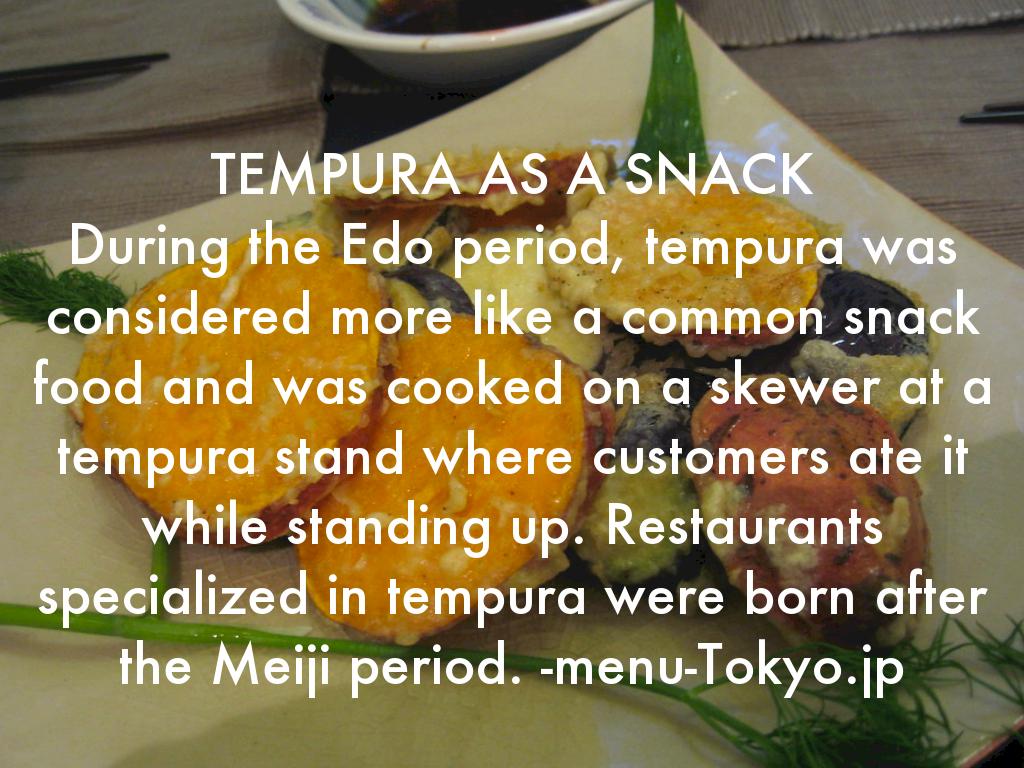During the Edo period, tempura was considered more like a common snack food and was cooked on a skewer at a tempura stand where customers ate it while standing up. Restaurants specialized in tempura were born after the Meiji period. -menu-Tokyo.jp