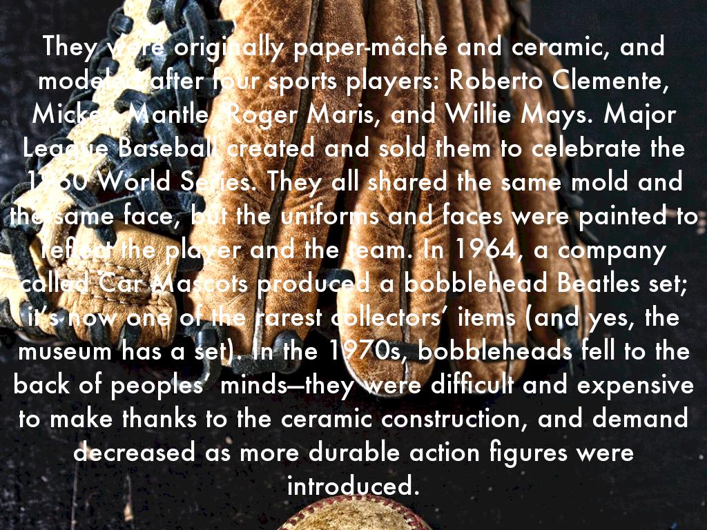 They were originally paper-mâché and ceramic, and modeled after four sports players: Roberto Clemente, Mickey Mantle, Roger Maris, and Willie Mays. Major League Baseball created and sold them to celebrate the 1960 World Series. They all shared the same mold and the same face, but the uniforms and faces were painted to reflect the player and the team. In 1964, a company called Car Mascots produced a bobblehead Beatles set; it’s now one of the rarest collectors’ items (and yes, the museum has a set). In the 1970s, bobbleheads fell to the back of peoples’ minds—they were difficult and expensive to make thanks to the ceramic construction, and demand decreased as more durable action figures were introduced.